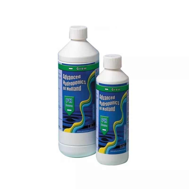 pH Down Grow de Advanced Hydroponics of Holland es un líquido corrector del pH para el cultivo de marihuana en tierra, fibra de coco o medios hidropónicos. El pH es la medida que se utiliza para determinar el nivel de acidez ( pH bajo) o alcalinidad (pH alto) de una disolución, en este caso se trata del agua de riego con o sin abonos y/o aditivos. Las plantas de marihuana necesitan tener los nutrientes disponibles dentro de un rango de pH que variará dependiendo del medio de cultivo que usemos, si estamos en crecimiento o floración, variedad, tipo de agua, etc. pH Down Grow de Advanced Hydroponics of Holland gracias a sus estabilizadores, bajará el nivel del pH y lo mantendrá estable en la medida deseada, especialmente indicado para la fase de crecimiento.
